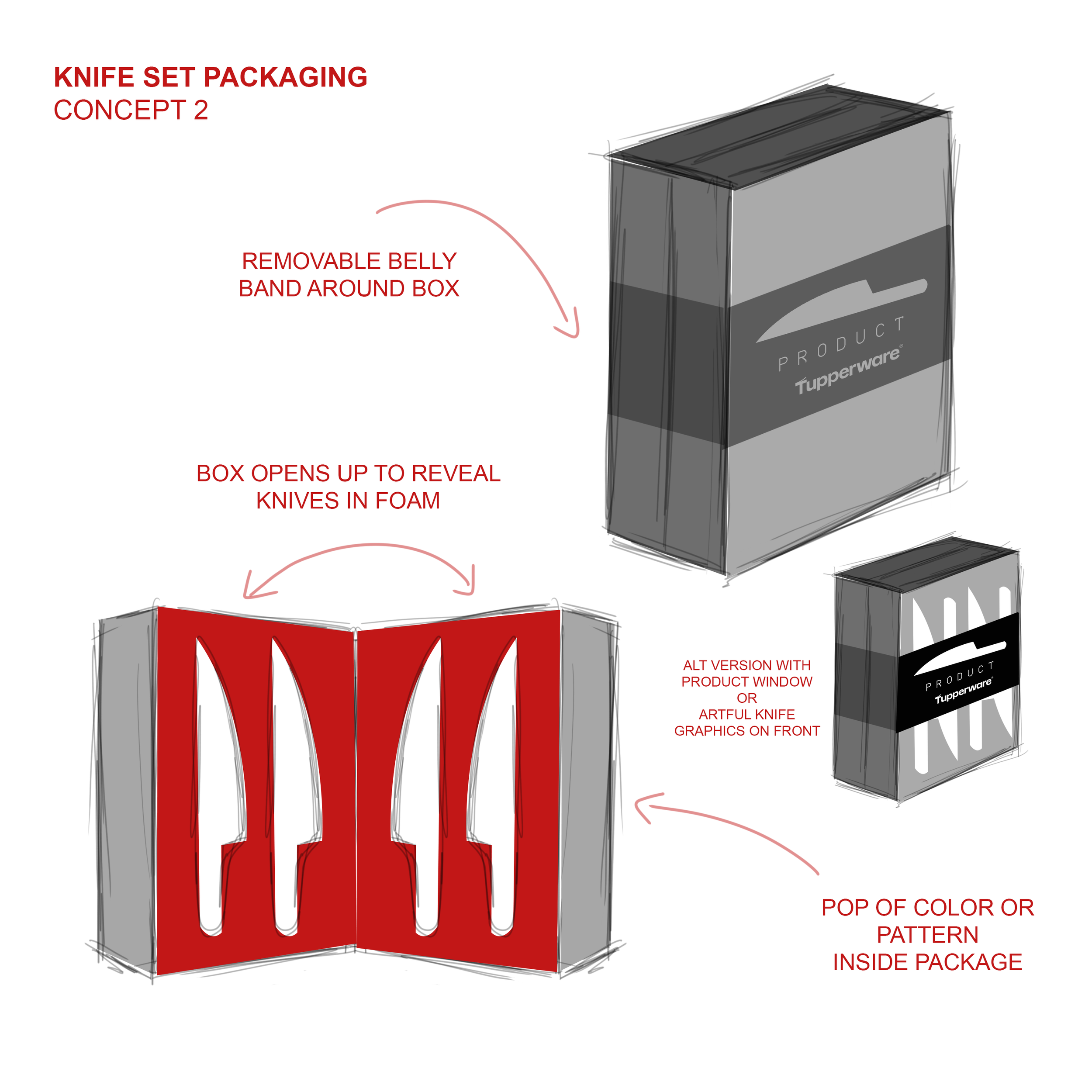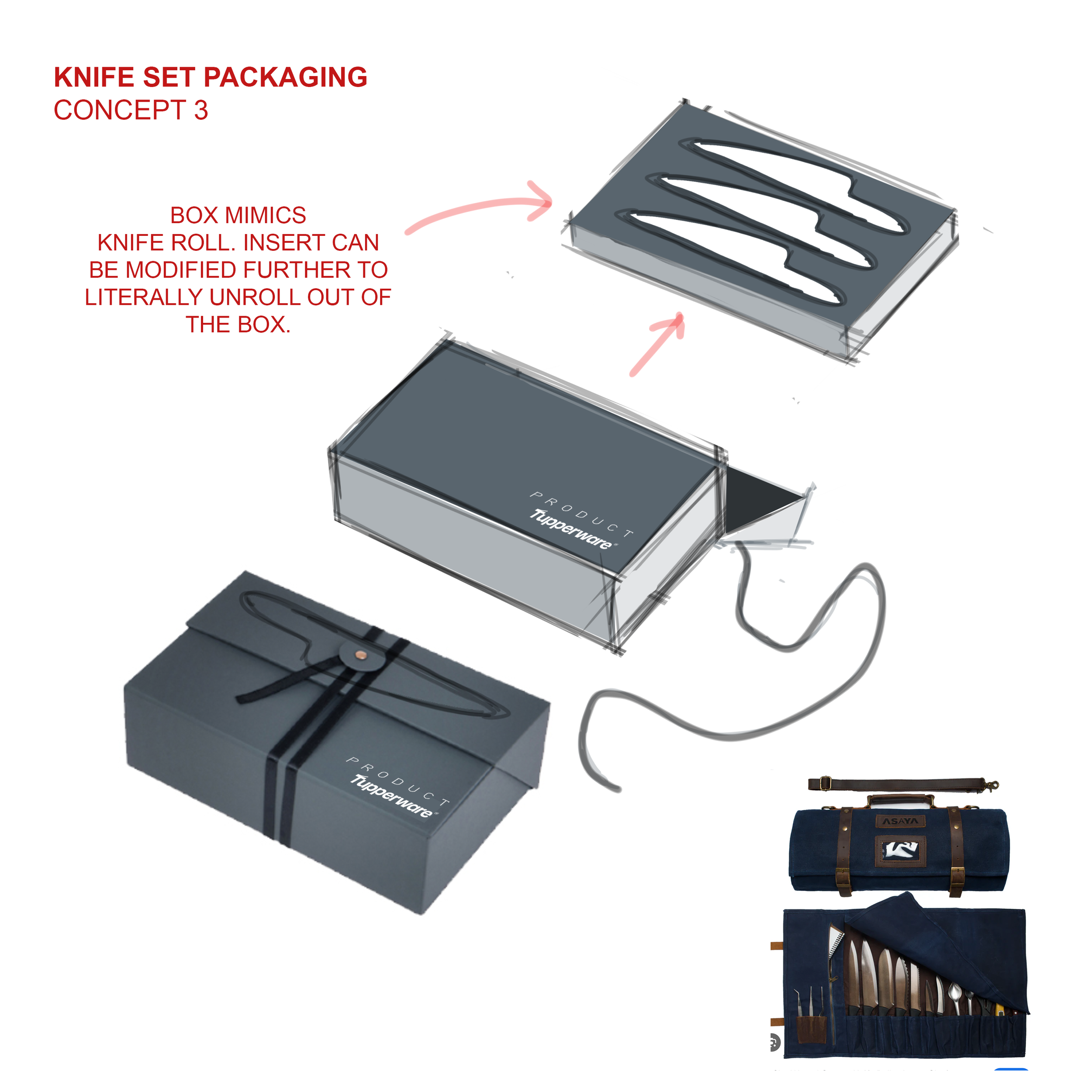 I was challenged to come up with several high-end packaging solutions for a knife set sold direct to consumers. Since this did not require a strong brick & mortar shelf presence, I focused on a premium unboxing experience. The exterior features a sleek, minimalist design inspired by a mix of luxury brands and a chefs knife roll – a traditional way to carry professional kitchen knives. The tactile exterior features leathery or fabric accents, evoking a professional, culinary aesthetic. This packaging not only protects the knives but also enhances the unboxing experience, offering a sense of deep craftsmanship and quality.